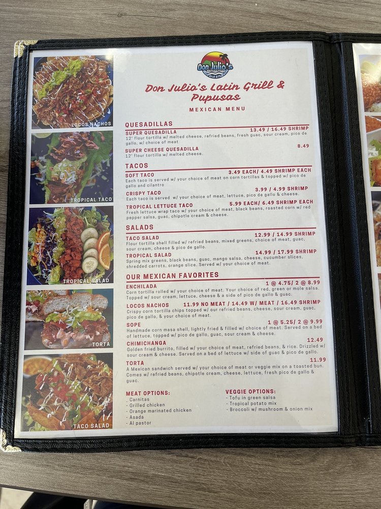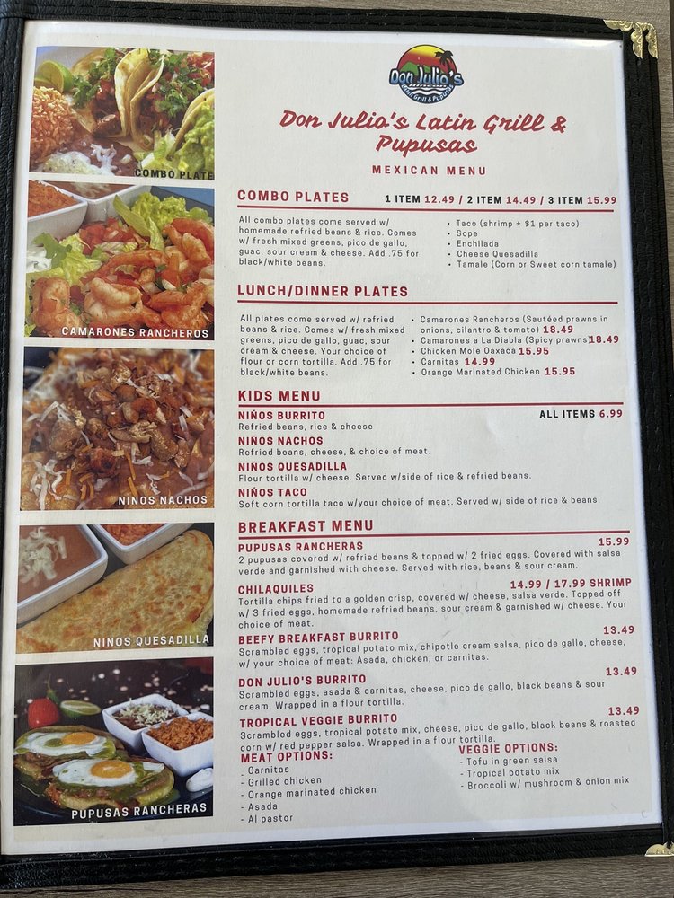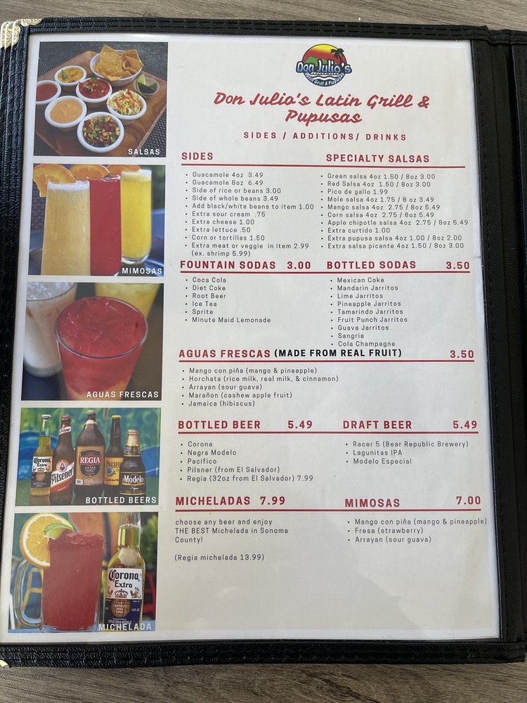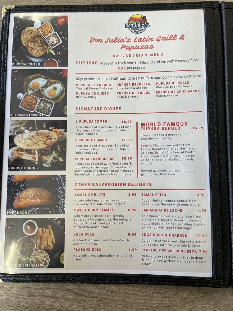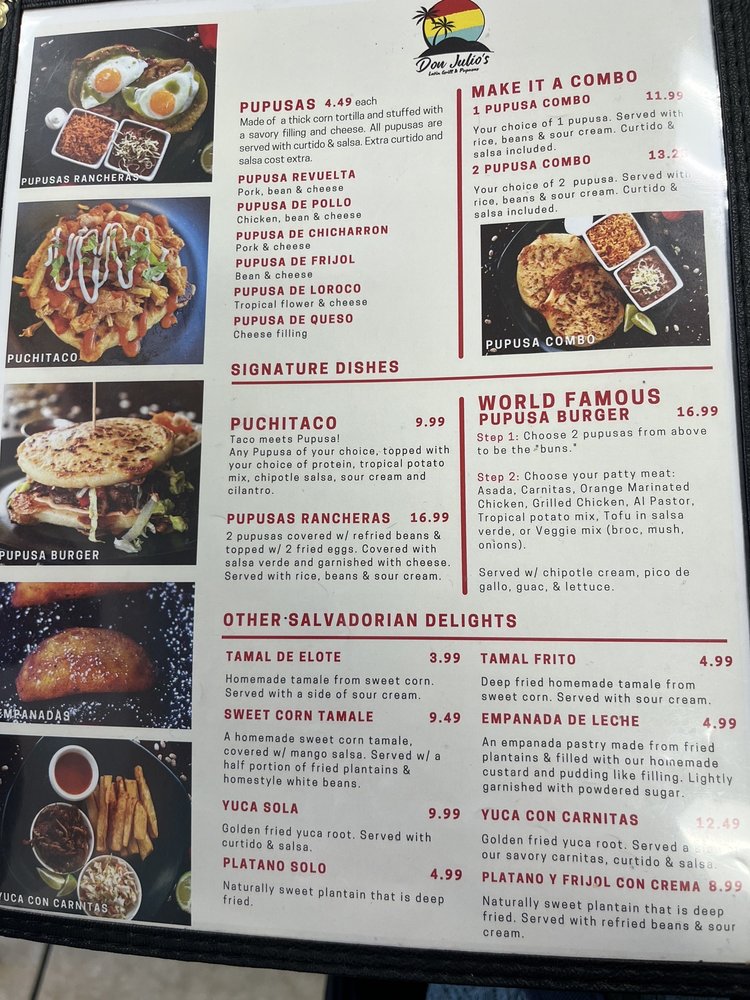 Don Julio’s Rincon Latin Grill and Pupusas, located in Rohnert Park, CA, offers a variety of traditional Salvadorian dishes, with a focus on their specialty pupusas. The menu features options such as Pupusa de Loroco, Pupusa de Queso, and Pupusa Revuelta, all served with rice, beans, and sour cream. One of the highlights is the Pupusas Rancheras Breakfast, a hearty dish of pupusas topped with refried beans, fried eggs, salsa verde, and cheese. Customers rave about the flavorful and authentic pupusas, with many praising the friendly staff and welcoming atmosphere of the restaurant. With options for vegetarians, vegans, and meat-lovers alike, Don Julio's is a must-visit for those looking to experience delicious Latin American cuisine in a casual and inviting setting.