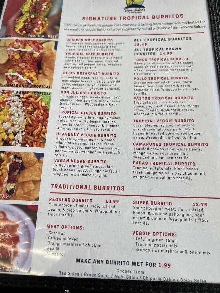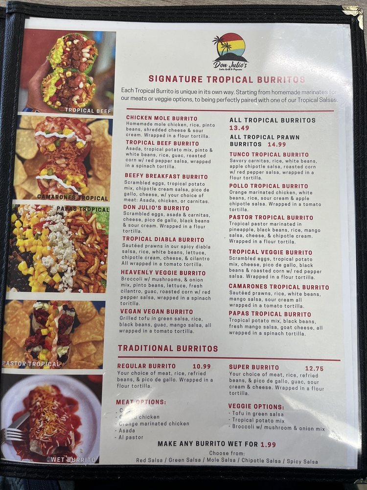 Asada. Tropical potato mix. Pinto and white beans, rice, guac, roasted corn with red pepper salsa, wrapped in a spinach tortilla.